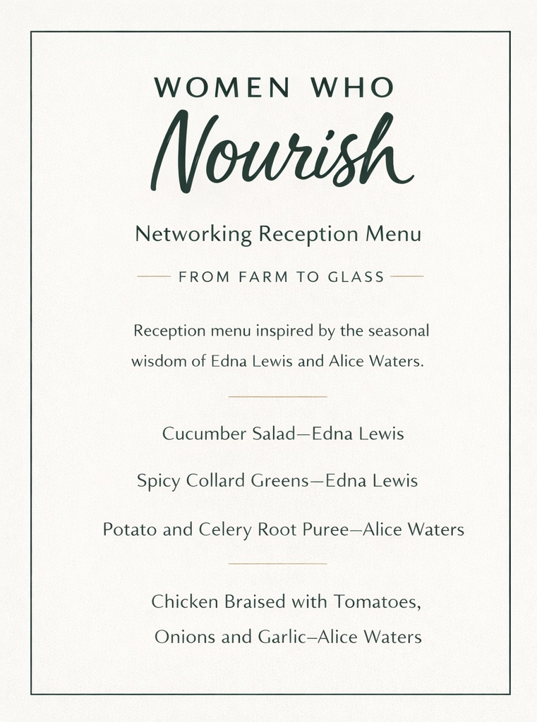 - A reception menu inspired by the philosophies of Alice Waters and Edna Lewis